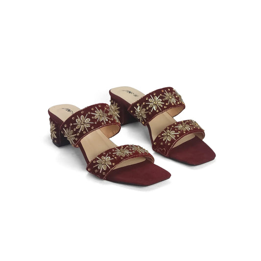 Maroon Velvet Embroidered Mules - Ethnic Block Heel Sandals | Nawabi Shoes BD